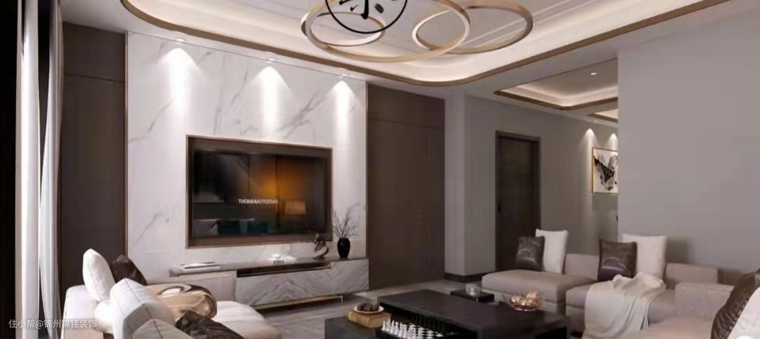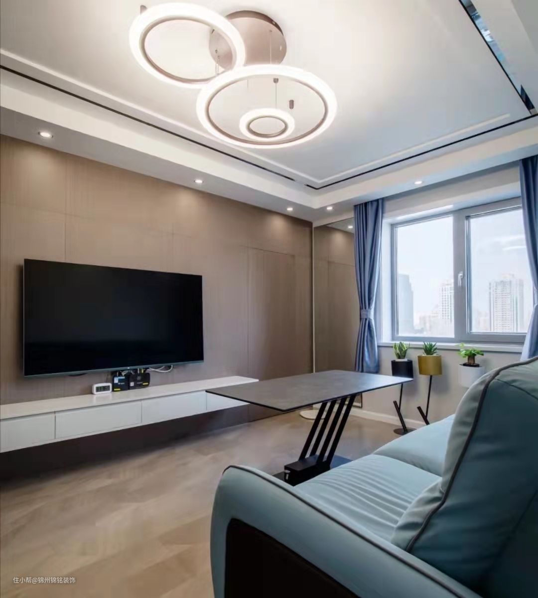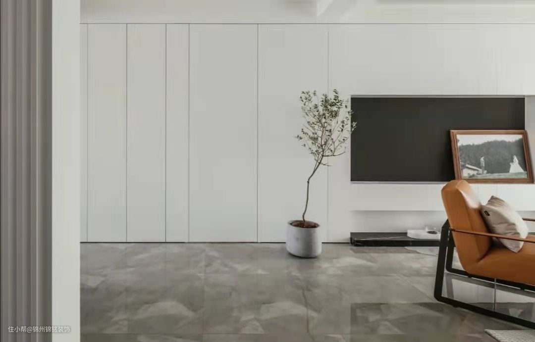 客厅空间拥有不同材质和造型的搭配组合,比如整墙木饰面板电视背景墙奢华自带隐形门设计与同色木地板相接一体,与传统房门相比大大降低视觉感,让客厅无敌显大通透。
