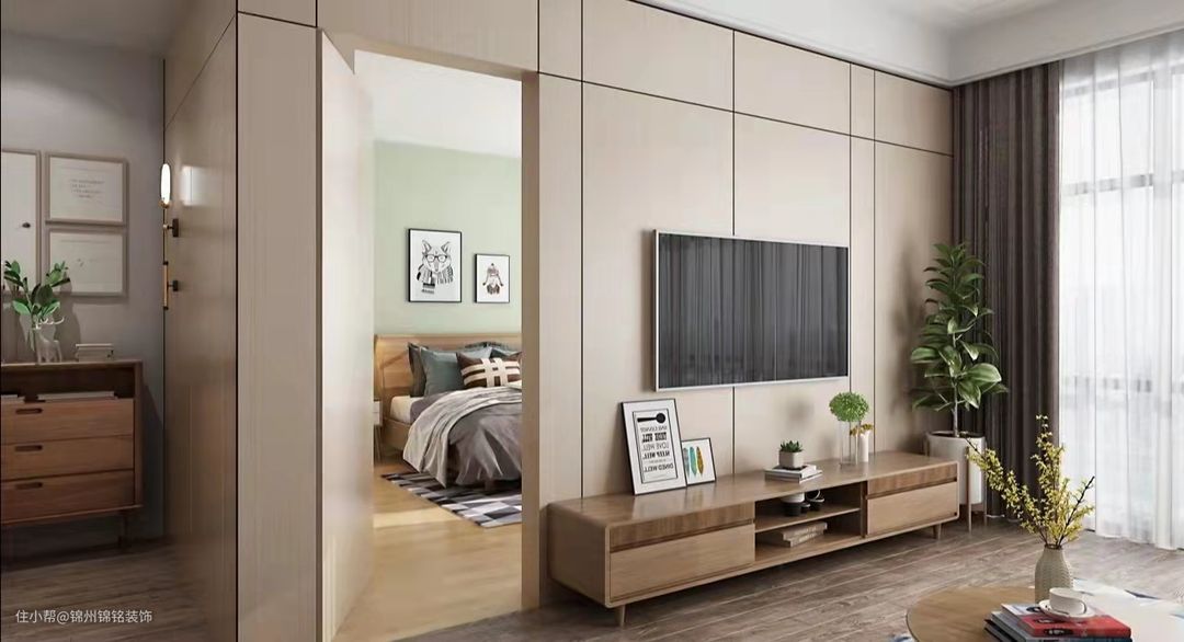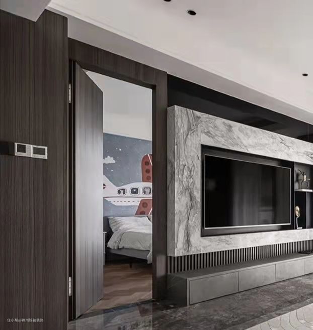 电视墙旁边的卧室门可与电视背景墙做统一隐形处理,颜色、造型、木纹相当和谐,看上去完全处于同一平面和谐统一。
