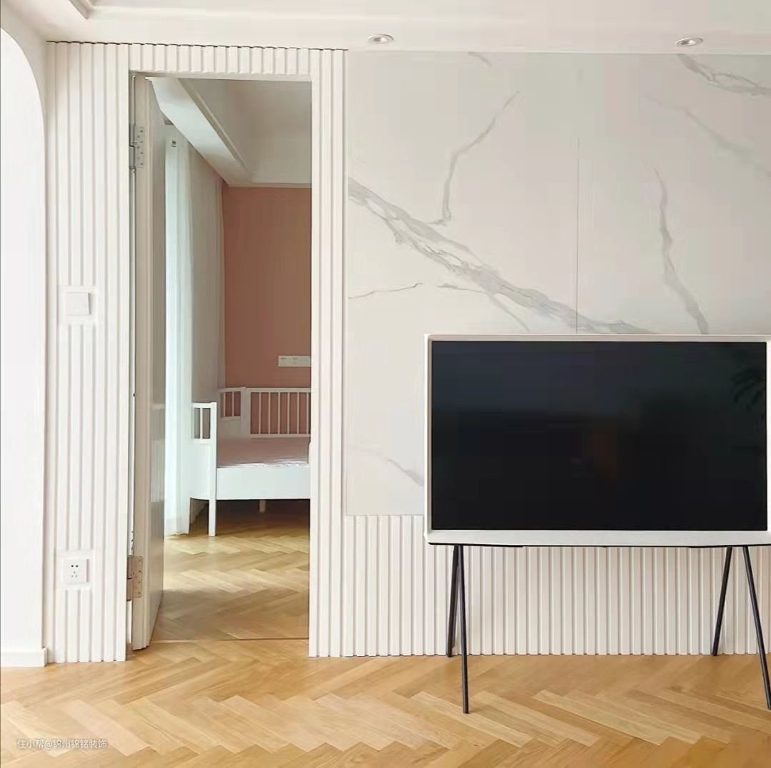 既保证了次卧门正常使用,又不影响电视墙的整体性。格栅旁边是白墙,不对称的造型。家里来客人都没发现这里原来还有一扇门。