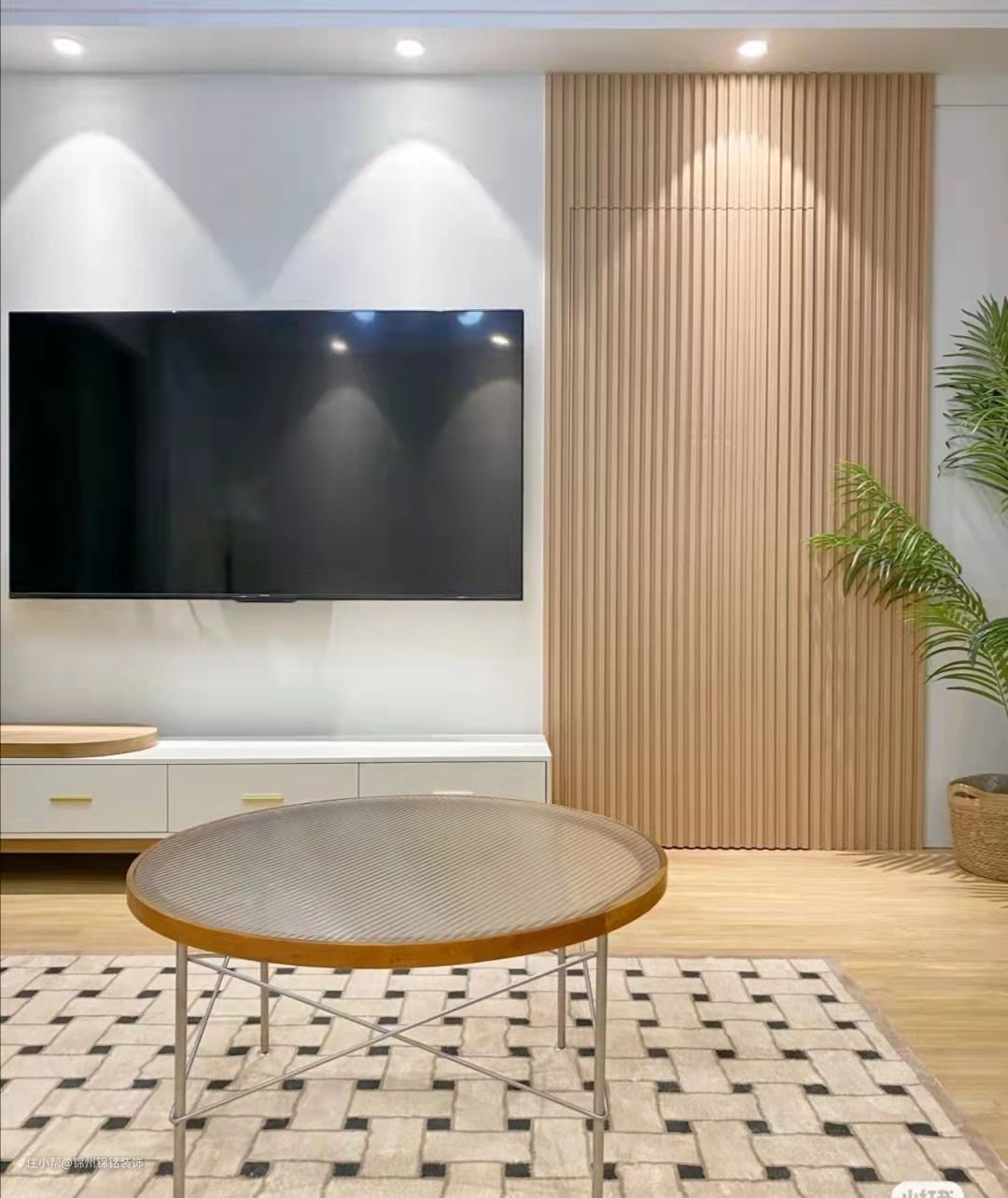 家具软装也是以原木风为主,电视柜是不对称的,白色+原木色和格栅隐形门互相呼应。