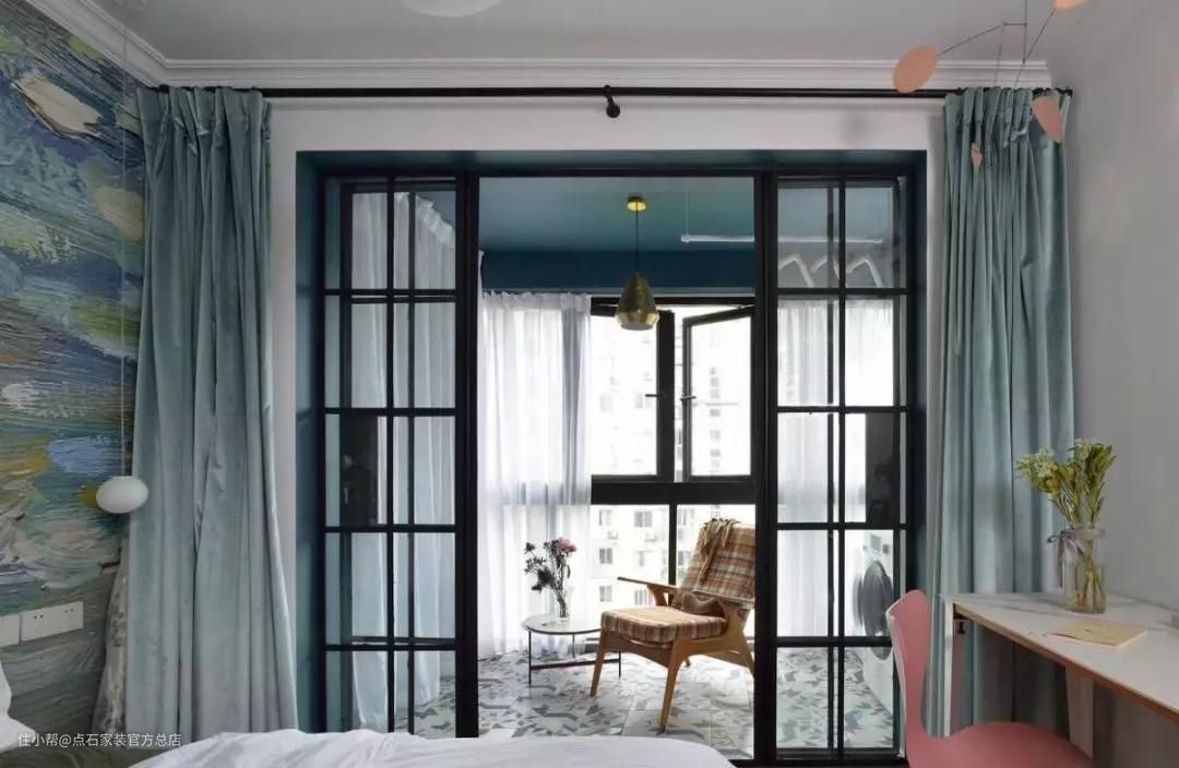 根据墙面的天蓝,薄荷蓝窗帘颜色选择浅一点的灰色。