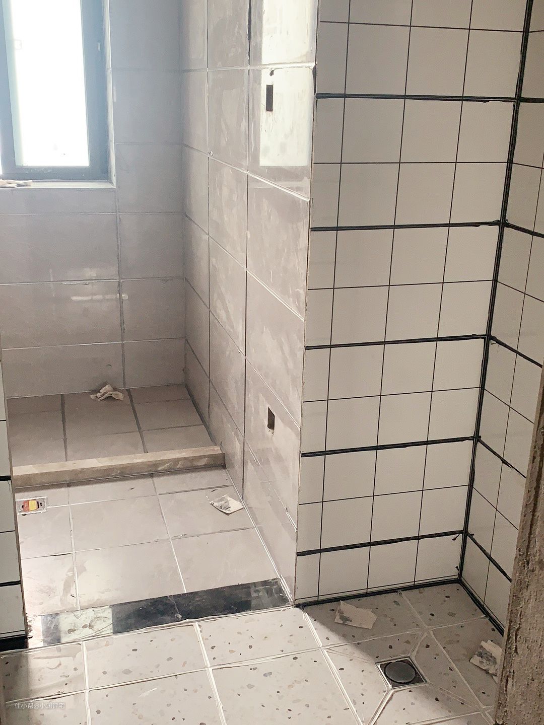 整个墙面都是黑边白底的小块瓷砖,看起来就让人心动。但实际做出来,往往并不尽如人意,比如下面这种▼