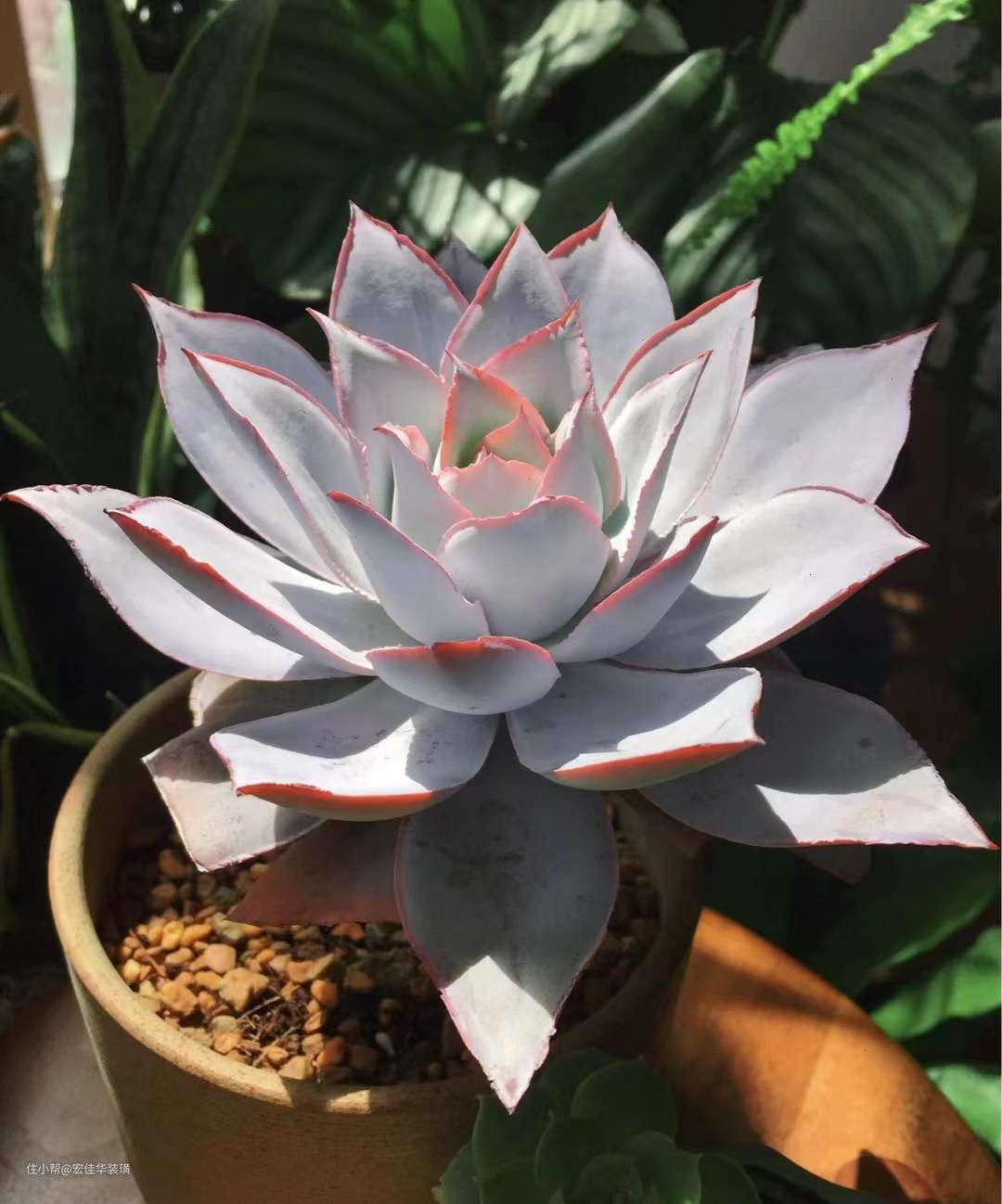 夏季是它变身仙女的季节,每天五个小时以上的日照,日照不足会导致叶片上的白粉减少,叶片变长,这也是判断光照是否充足的依据。