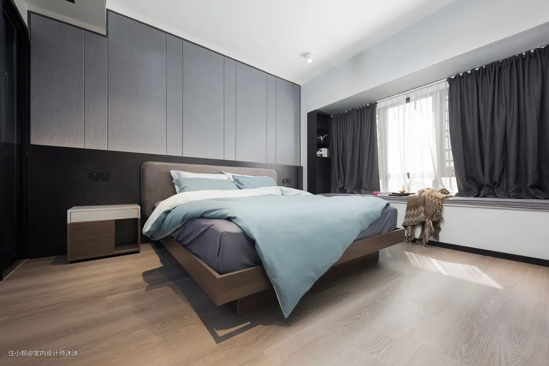 床头背景墙以黑色木饰面墙裙+灰色硬包的设计,搭配布艺靠背与木架床体和湖水蓝的床品,呈现出了一个简约舒适的卧室氛围。