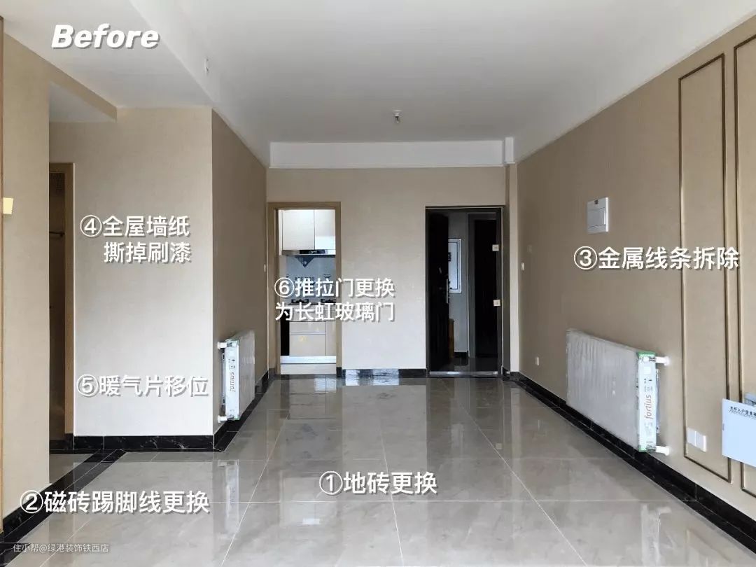 精装房客厅毛病很多:地砖太土,瓷砖踢脚线特别碍眼,还有浮夸的壁纸和金属线条,都降低了屋子的档次。针对原有的瑕疵部分,设计师进行了全新的改造。比如踢脚线全部更换,瓷砖敲掉后重新铺贴,暖气片移位等等。