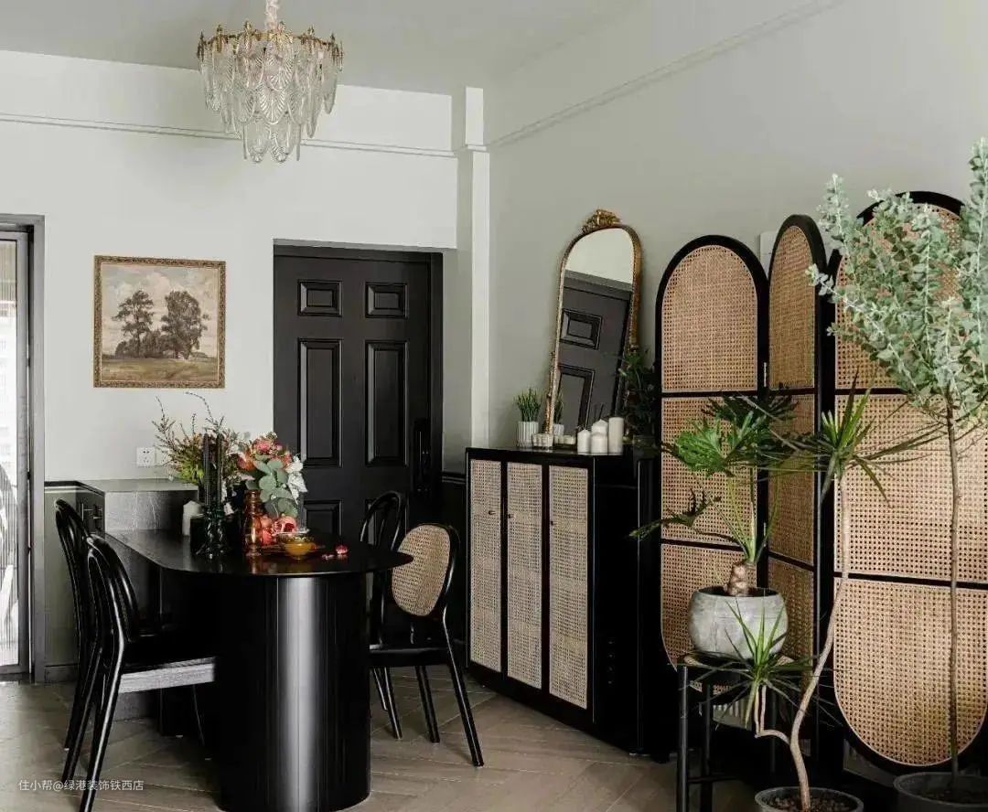 改造后的客厅更显复古经典之感,分色式的墙漆,还有人字拼木地板,以及黑色实木的踢脚线,都让整个家散发着满满的高级感。客厅的屏风后面是一个长1500mm的暖气片,为了美观,选择一个可移动的木质藤编屏风,在不需要开暖气的季节就可以遮挡起来,前面再摆放上错落有致的绿植,做为一个端景效果。