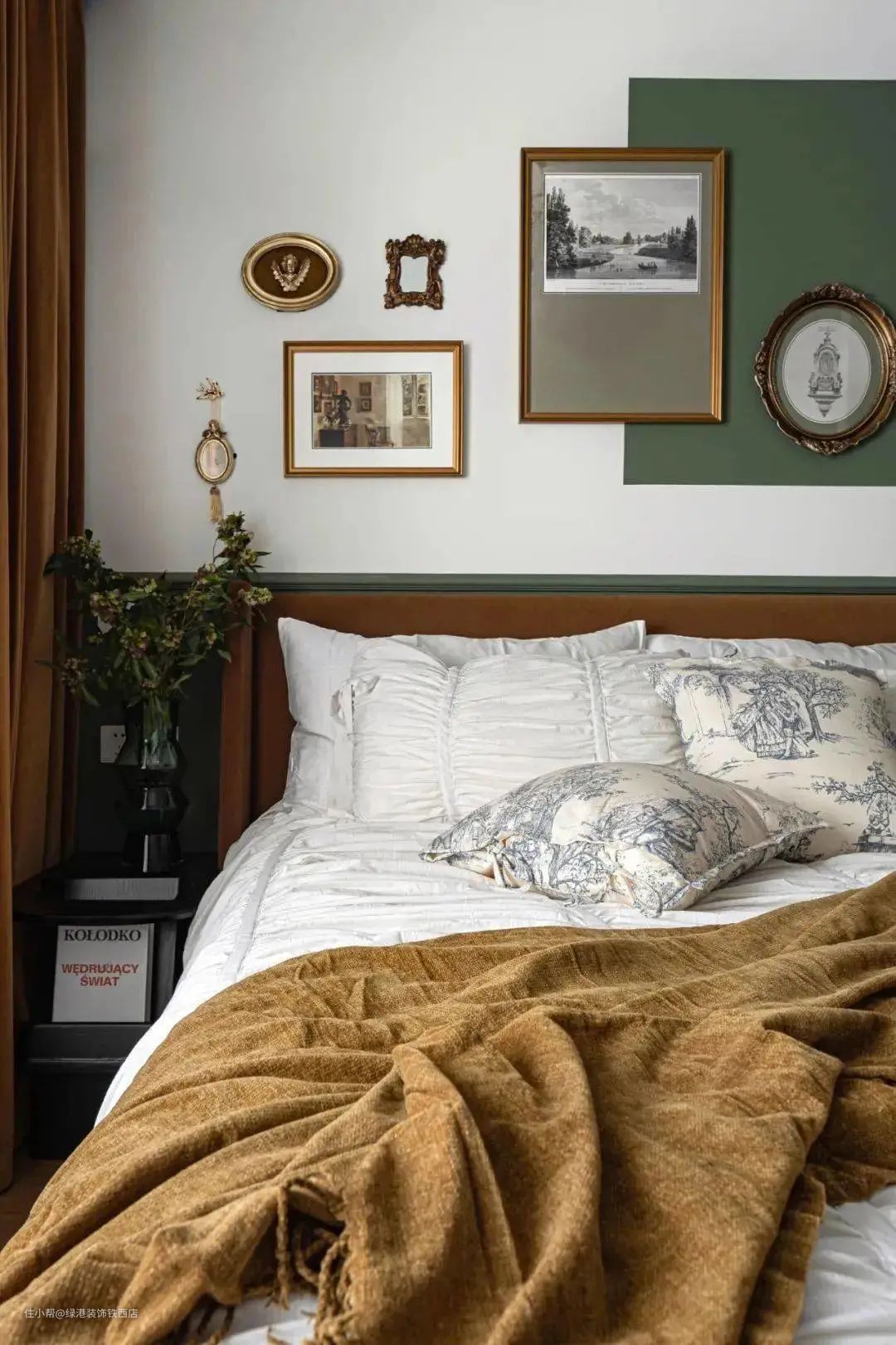 主卧用石膏线贴一个高1100mm的腰线,下面刷复古橄榄绿色,上面刷浅灰色,衣柜选择和墙漆同色定制,墙面为有个色彩呼应,刷一个橄榄绿方块,组合画搭配起来更有层次感。靠墙位置,设计师打造了一个深绿色的衣橱,在色调和形状上都符合英伦复古风。