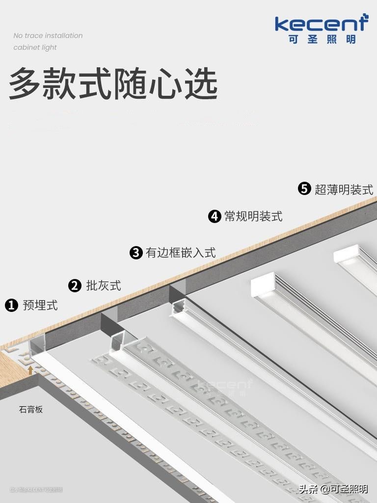 如今在市场上销售的LED线条灯,有多种款式任消费者挑选,像KECENT可圣照明热销的线条灯产品,就有平角、阳角、阴角这三大类可选,其中又细分到平角批灰式、阳角批灰式、阴角批灰式、单边预埋式、平角嵌入式、阴角明装式、常规明装、超薄明装等多种类,很好地满足了不同消费者的需求。像有些消费者比较倾向于免开槽的产品,那就可以选择阴角明装、常规明装和超薄明装这三款,即使在家居装修的后期也能轻松安装上,随时享受明装线条灯所带来的艺术家居氛围。
