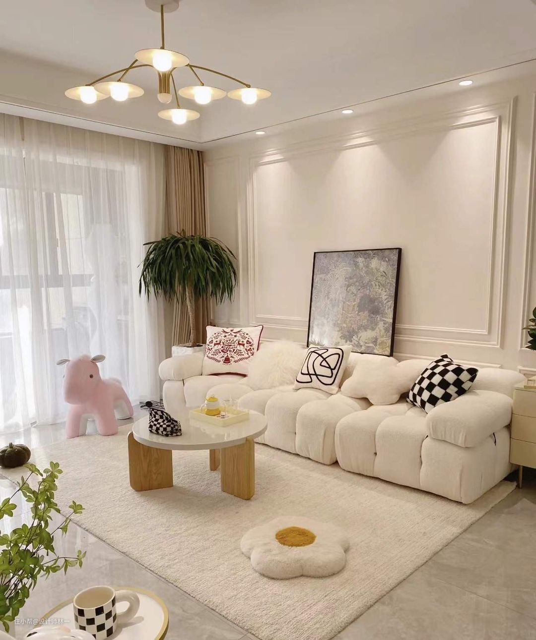 沙发背景墙是白骆驼乳胶漆+pu线条,表面花纹清晰、逼真,立体效果明显,不仅省钱还让空间更加有线条感与立体感,外框4.5cm,内框2.5cm,效果非常好;