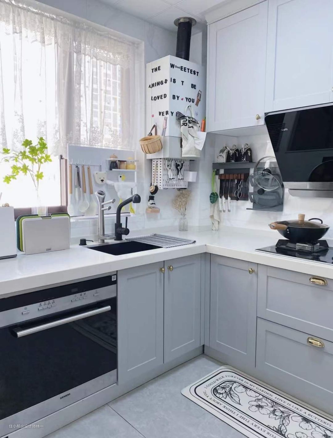 厨房是U型的,大约6㎡,灰蓝色的橱柜干净清爽,门板也很好打理,浅灰色的地砖连通餐厅通铺,视觉上有延伸感,整洁又通透。