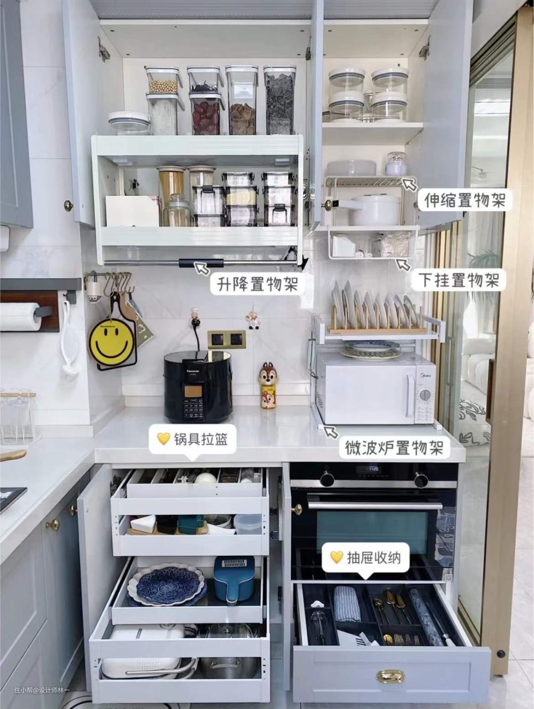 橱柜收纳:调料抽收纳酱料瓶等,上下两层拿取方便,灶具下面是碗篮和锅具篮,上层附带小抽屉收纳筷子、勺子等;