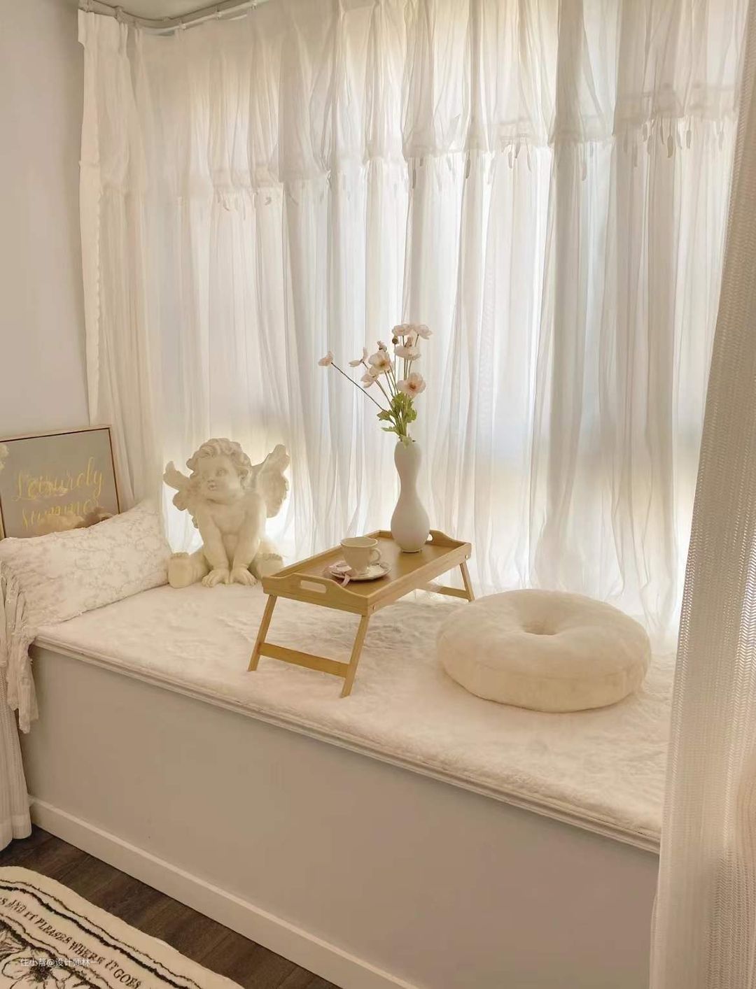 飘窗没打掉,直接打造了一个休闲区域,挂上少女心十足的纱帘,毛茸茸的飘窗垫,中间放一个小桌子,氛围感马上就出来啦,平时在上面休息晒太阳,超级舒服又惬意;