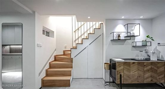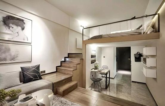 空间的利用率更高,尤其是4.8米的层高的公寓楼,自己搭板做二楼,不论按照哪里的房价来看,都是较为划算的买卖,空间使用率不低,而浪费较多的地方则是楼梯区域,一般会采用储物柜,或放置冰箱的方式来进行填充,八仙过海各显神通。