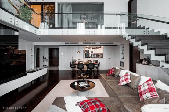 有很多复式楼都是一面落地窗采光,所以很常见的方式是,LOFT客厅进行挑空设计保证光线能有效进入到客餐厅空间,而6米层高的复式楼在挑空的同时,还会强条辅助光源的补充,否则室内容易暗沉。