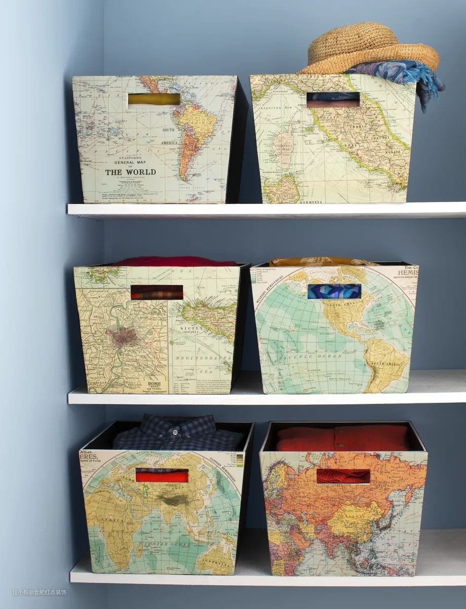 在这里装扮一下,现成的储物箱借助旧地图、哑光饰面 Mod Podge 胶(干燥后会变得透明)、油漆刷和油灰刀传达颜色、图案和旅行灵感。抚平气泡。