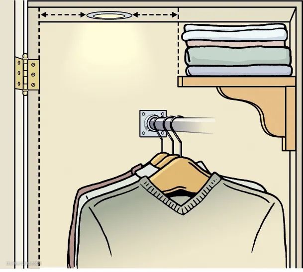安装不当的灯具会引发火灾,更不用说不可靠了。电工的弹簧,他可以通过打开门或翻转外墙开关来激活壁橱固定装置。如果您想设置充电站、熨斗或蒸汽挂烫机,也可以添加一个插座。