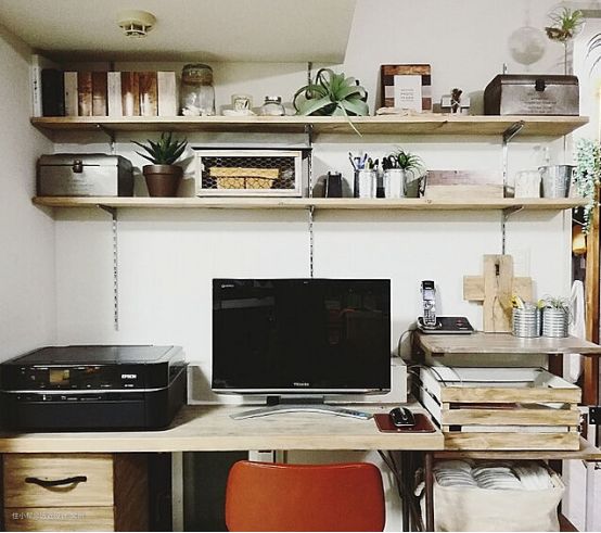 这是在桌子下面放一个架子的案例,它往往是一个死空间,作为存储空间。 如果使用与地板颜色相同的搁板,它们将非常适合空间。 有醇厚感的房间,非常舒适。