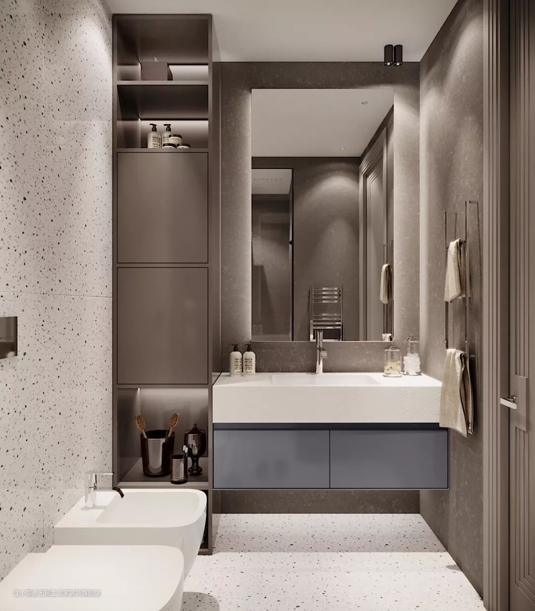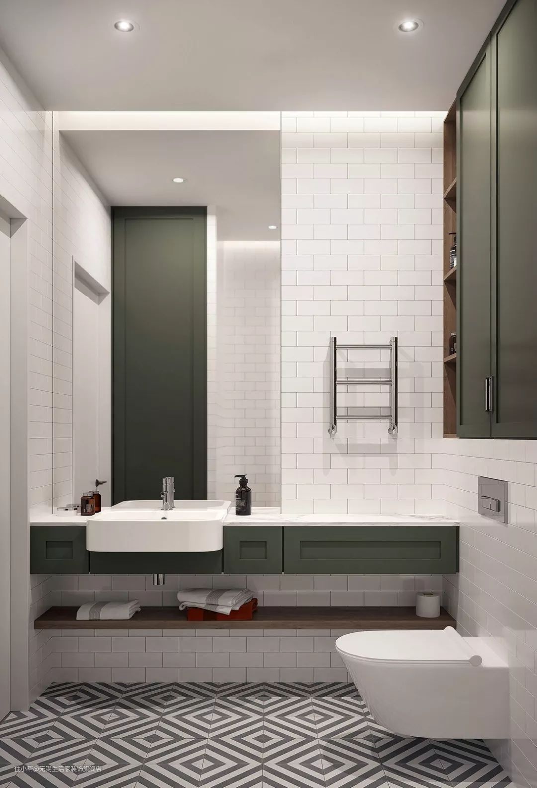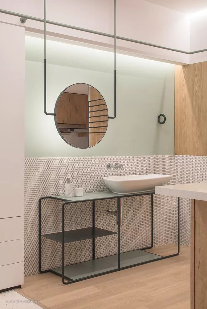 半埋盆适合在小户型卫生间安装,一半外露,一半嵌于台面下。若是要购买这类手盆,在卫生间安装之前,需要提前与装修师傅沟通,拿捏好台面的尺寸,因为半埋盆须要与台面紧密结合。若需要节约空间,建议选择入墙式水龙头搭配面盆。