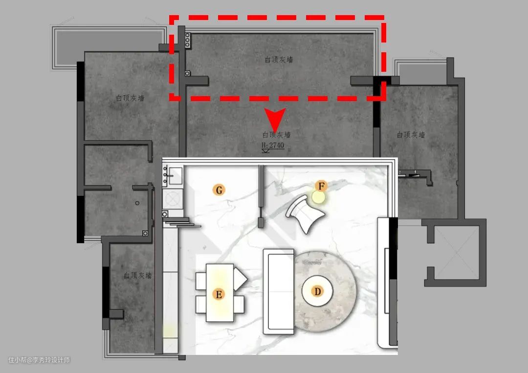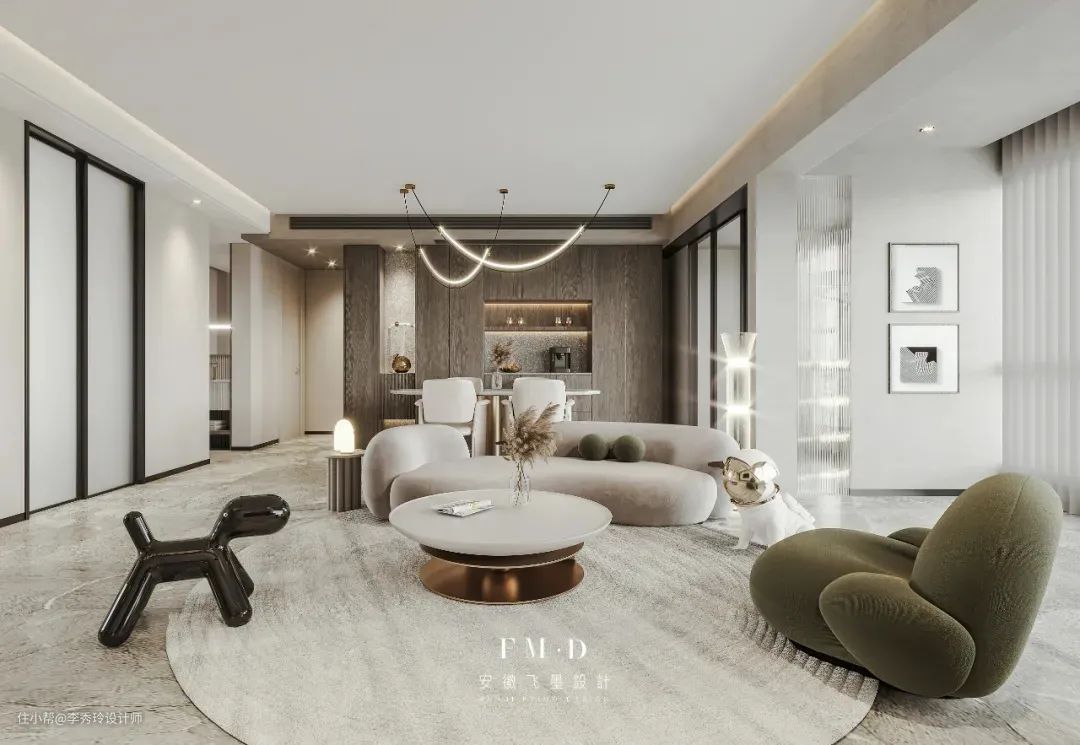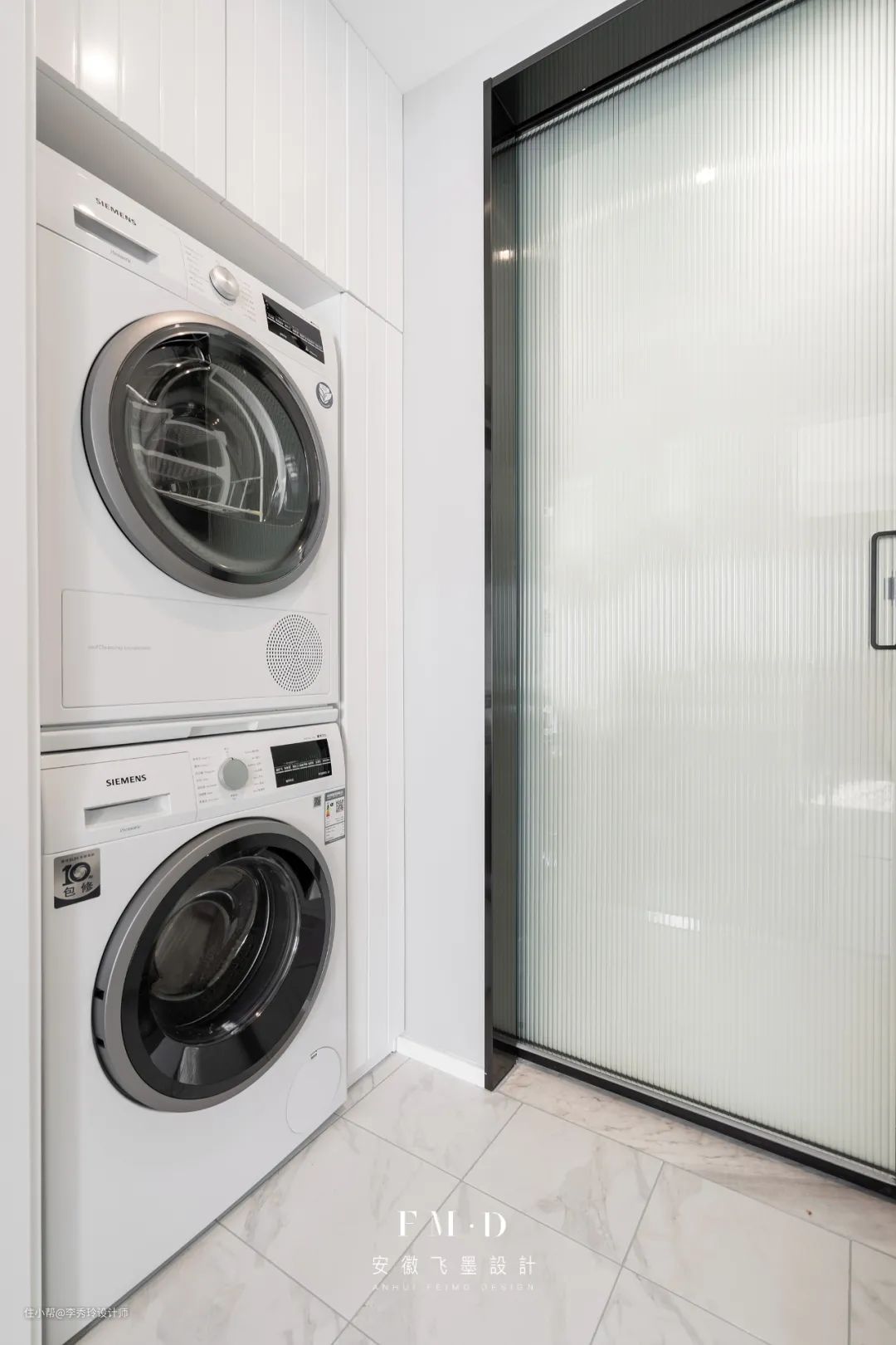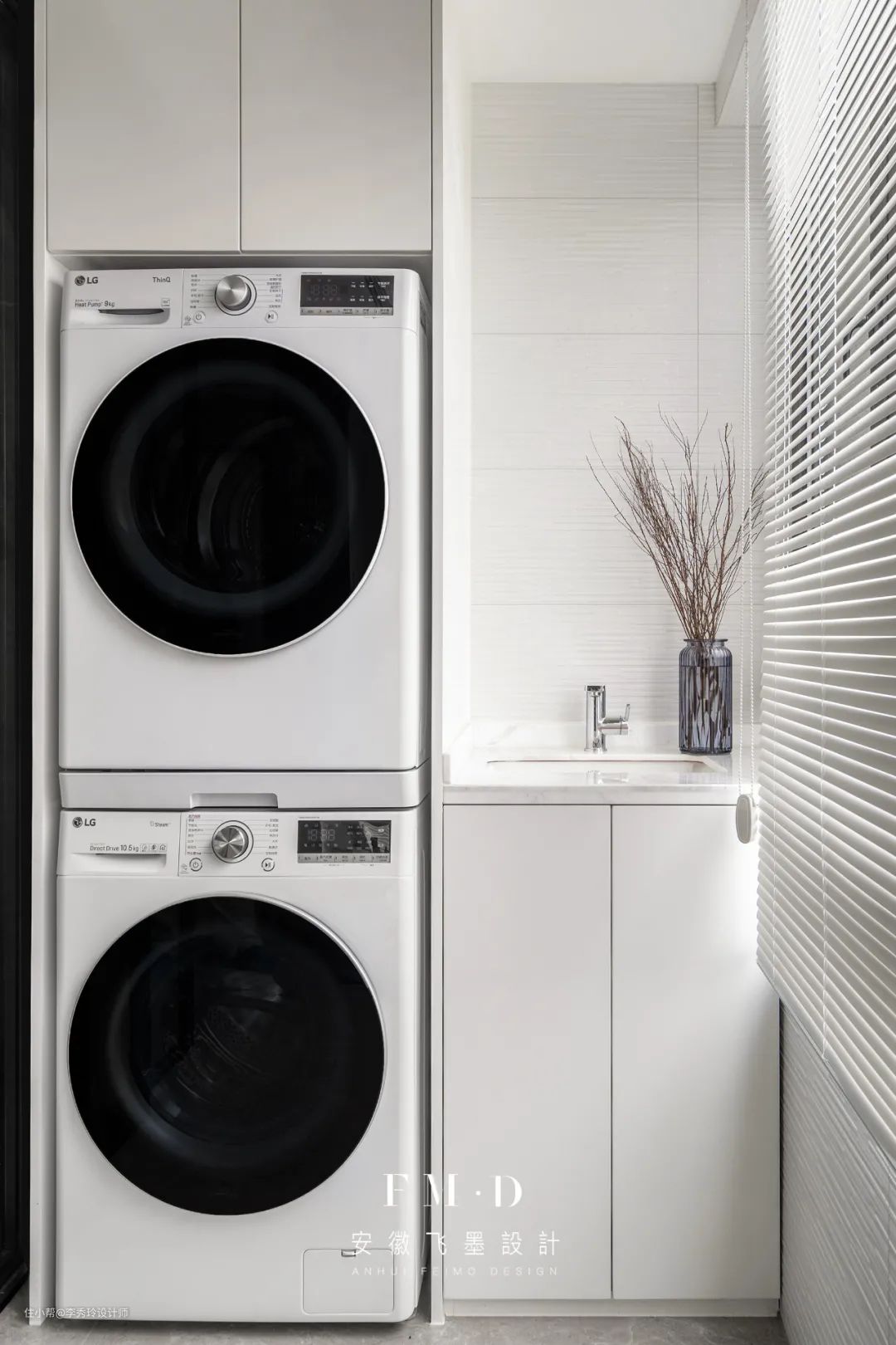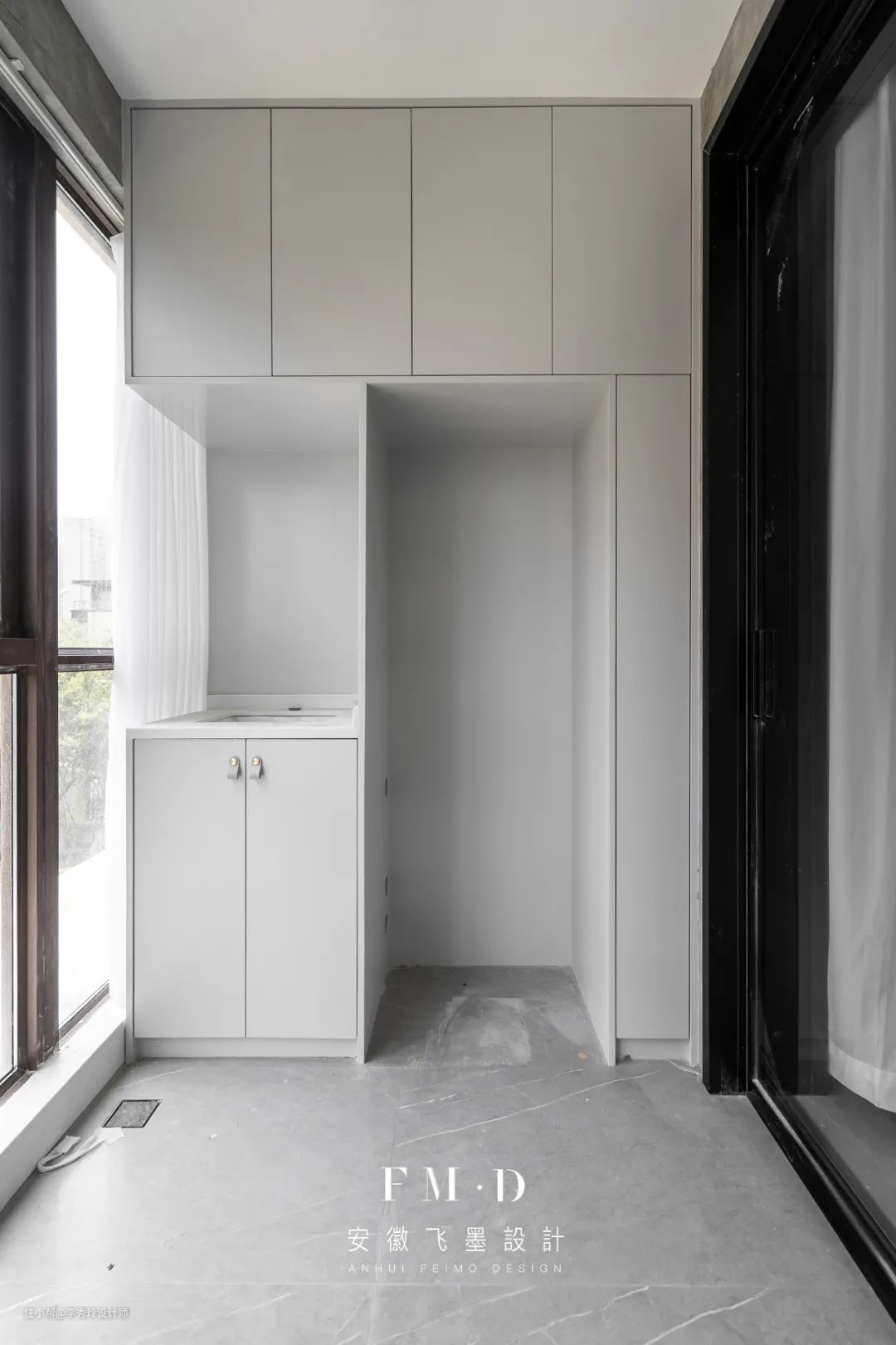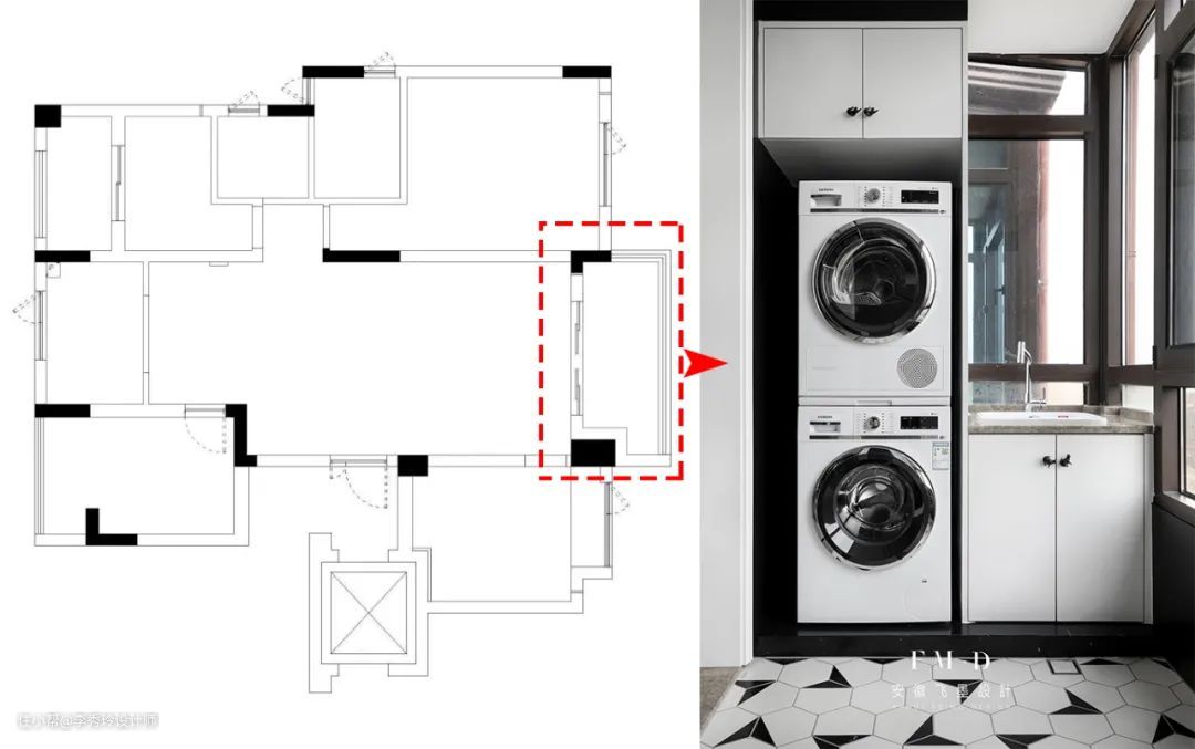 飞墨家【徽创君泊】的案例中,便将阳台一分为二,一边纳入客厅,剩下空间独立出来,做晾晒区使用。
