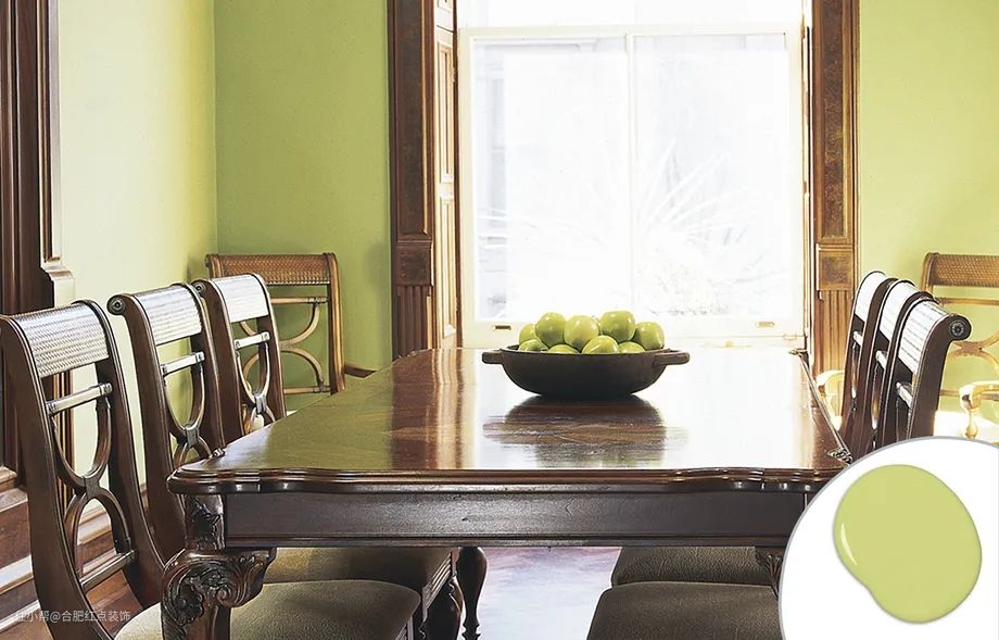 这种清新、充满活力的颜色可以突出华丽的染色木制品,并为正式空间带来清新的外观。当它一直延伸到高高的天花板时,就像这里一样,它还可以平衡深色地板和家具,同时将焦点放在浅色天花板和醒目的吊灯上。