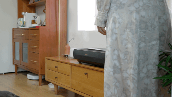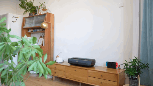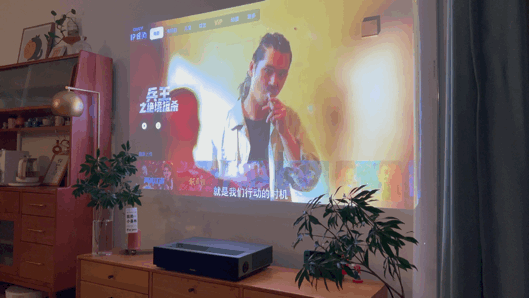 之后便是迫不及待地来体验播放效果啦!前文中提到,激光电视采用的是超短焦超广角投影,即距离墙面很近的情况下也能轻松投出大尺寸画面,当然你也可以通过拉激光电视与墙面的距离来获得更大的画面,理论上来说,距离越远,画面就越大,不过清晰度也会随之降低,因此激光电视通常都会设定一个最佳的投影距离。