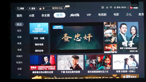 海信88L9F的系统是基于安卓9.0开发的JUUI,系统界面跟我家五年前买的智能电视一样,用的是CIBN酷喵影视的主界面,因此我上手起来其实还蛮快的。跟峰米相比,操作界面不够清爽,界面内的信息量多了不少,横向切换时会觉得有点凌乱,时不时还会伴随着侧边栏的广告。