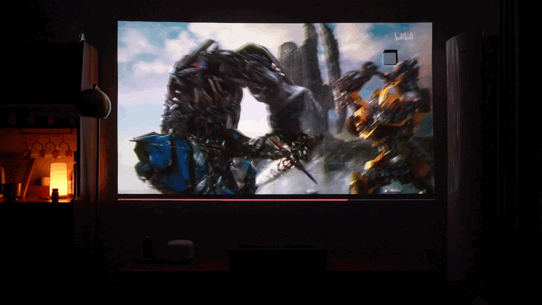 相较而言海信88英寸的画面在代入感方面就要略逊一筹,躺在沙发上观看时画面两侧的空余的地方总让人有种不够尽兴的感觉,甚至会让人有种冲动想要放大画面把整个墙面填满。在体验激光电视以前,80英寸以上的屏幕对我来说只是一个概念,但在实际体验过之后才知道,88英寸的画面相较于100英寸在视觉观感方面确实要大打折扣,怪不得那些影视发烧友都要在预算足的情况下优先上大屏。