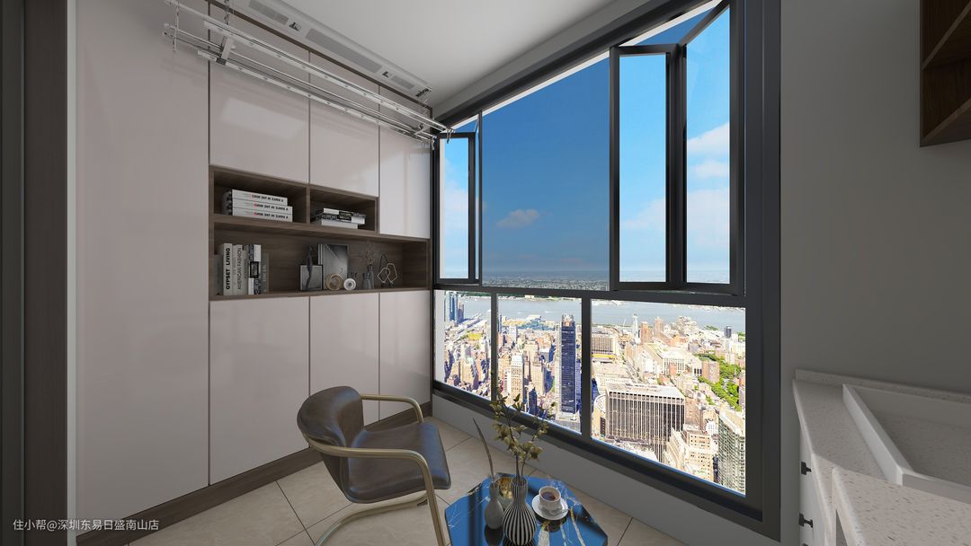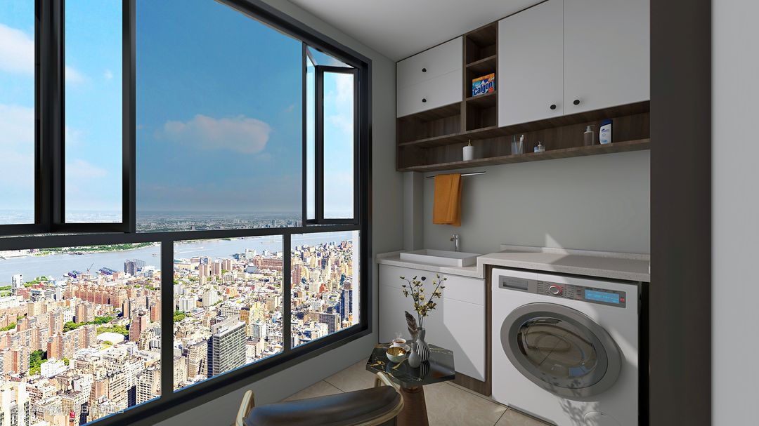 保留原有双阳台结构,一边连通保姆房,形成一个小型家政间。洗衣机、手洗台盆、家政储物柜,最实用的阳台空间。休闲阳台双扇大推拉门,保留最大面积的通风及采光。同时上方设立升降晾衣架,满足节假日家庭成员聚集时的衣物晾晒需求。