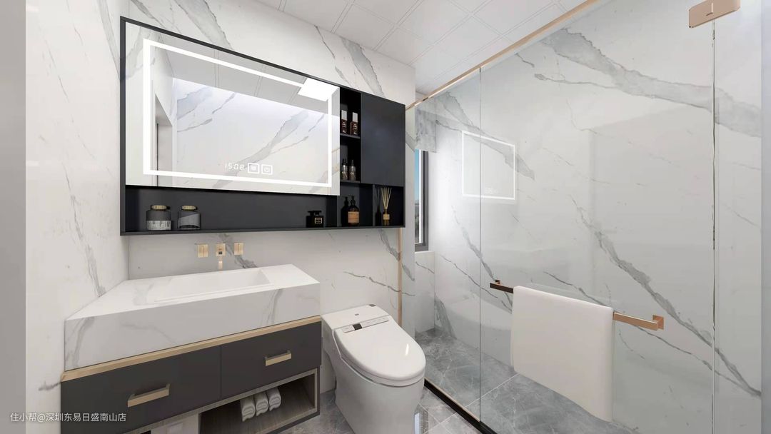 干湿分离的卫生间,黑金与白构成现代简约的空间氛围。