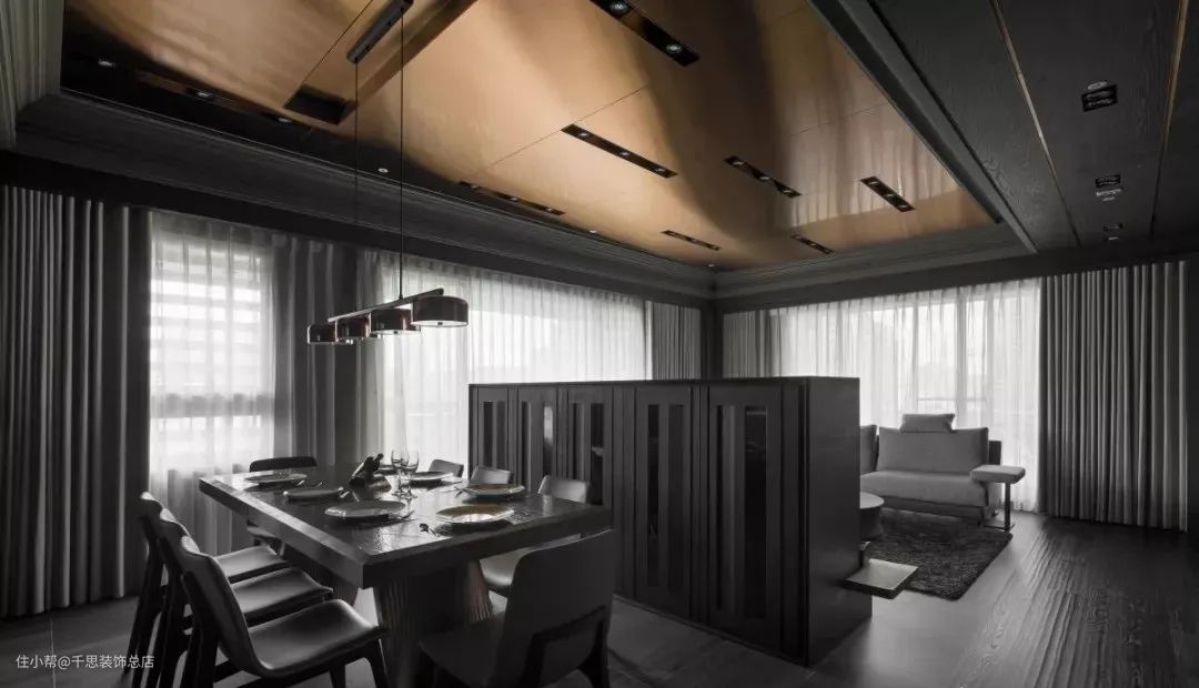 这里可选择给电视机打造面矮墙,放在餐桌与沙发中间,既不影响采光,美观度还很OK~