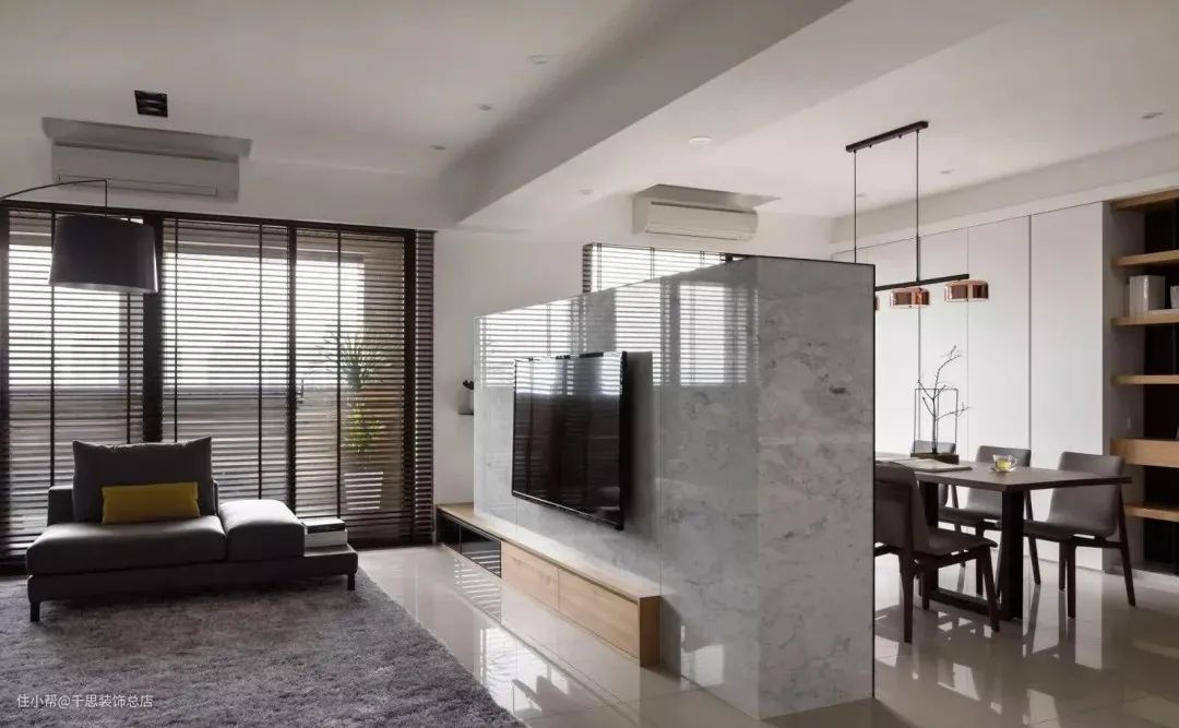 或者设计成矮柜,利用电视本身来作为隔断,不过要注意,这种设计具有一定危险性,要将电视下方嵌入柜体,并进行固定,防止不小心把电视碰倒了。