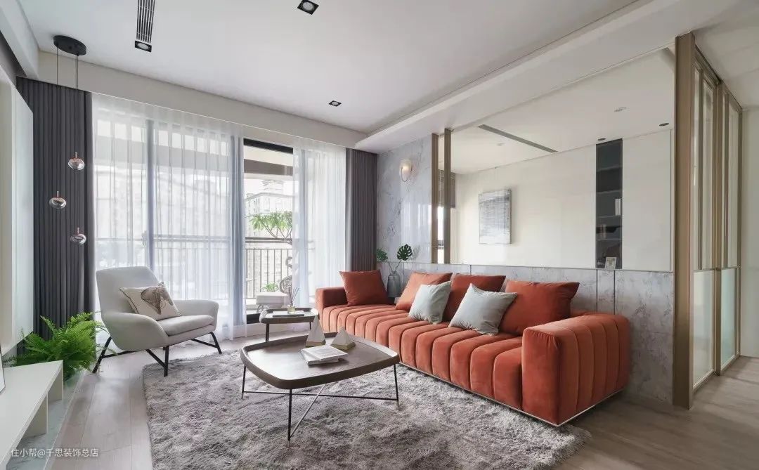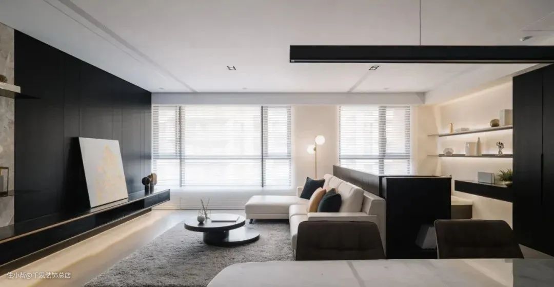 如果接受不了沙发不靠墙,也可以在沙发后打上半柜做收纳,或是直接打书桌、吧台等,既丰富了功能区,又使沙发更可靠,心理上的安全感更足。矮柜的设计也可以多种多样,与家里的整体格调匹配就好~