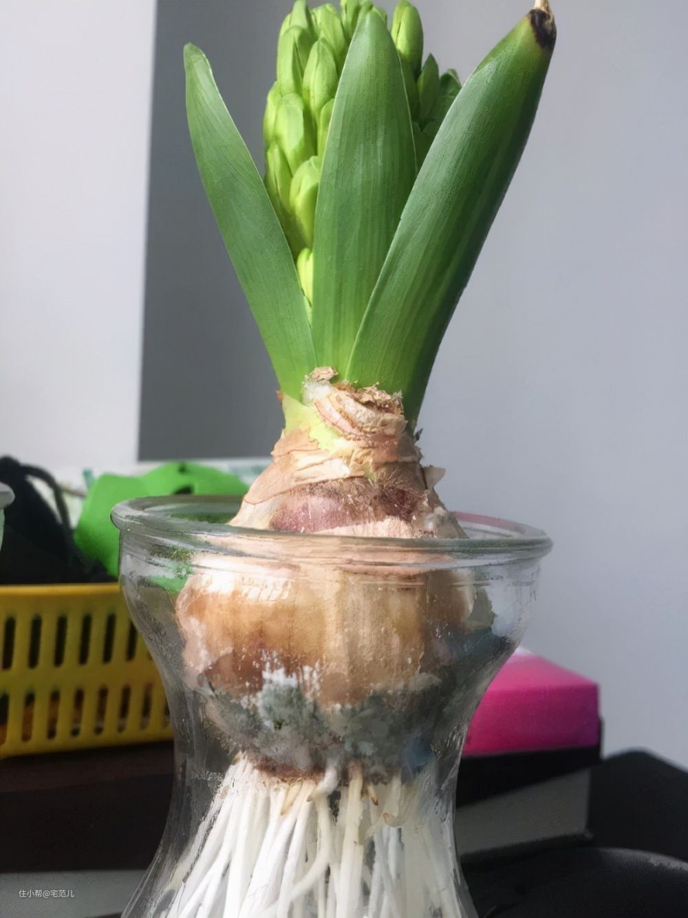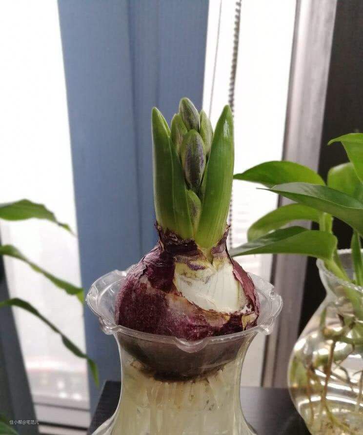挑选表面光滑,没有病虫害和损伤的种球,一般商家都会赠送水培瓶,将种球放在瓶口处,加上水,让水没过根部,一周左右更换一次晒过的自来水,慢慢它就会长出白根,上面长出嫩绿的叶子,开花漂亮的花朵来。