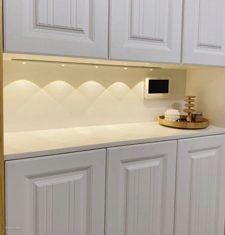 其次它还是个感应灯,具备实用功能,布置在玄关柜内,人来即亮,一回家便可提供基础的照明所需。