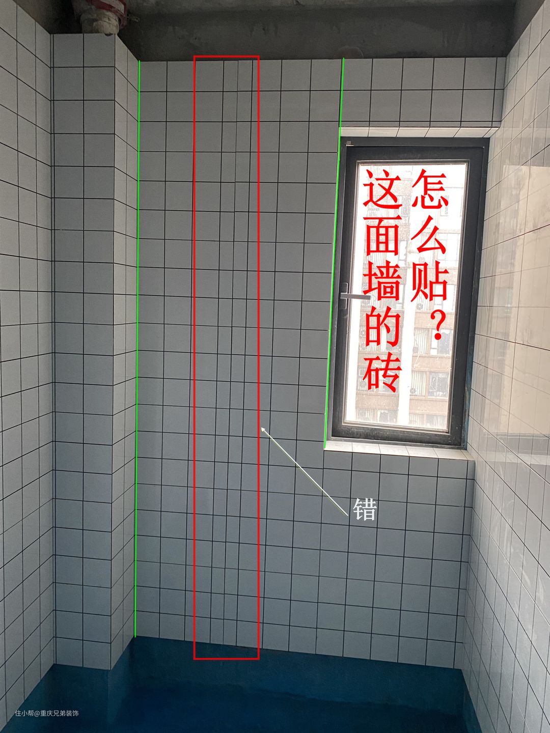 第三:第一块砖的铺贴,应该根据环境来定,比如说有没有落水管,窗户,壁龛等,怎么贴出来好看,这是一个资深泥工的必备技能,一般来说,包了落水管,就可以从落水管出开始贴,美观第一,减少损耗是第二位的,像以下这种方式必然是返工的。