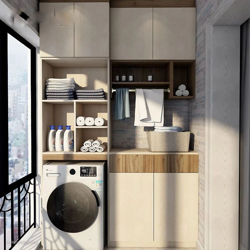 洗衣机柜所拥有的收纳空间,除了放置洗衣机外,其余地方还可以放置家中的闲杂物品。对整个阳台空间起到了整理、归纳的作用,而且整齐、不乱。