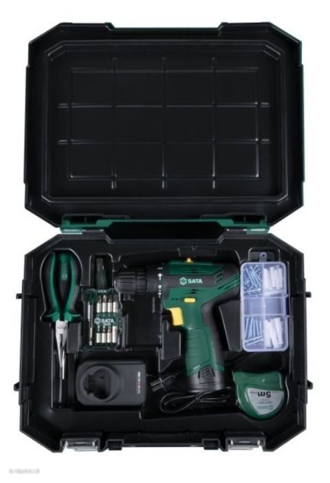 工具箱中每一件工具都被整齐摆放固定,包含12V锂电冲击钻、尖嘴钳6"、凯隆系列钢卷尺5x19mm、6.3mm系列旋具头螺丝批组等工具。