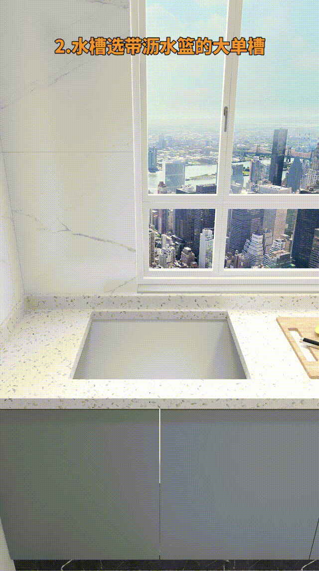 2.水槽选带沥水篮的大单槽,深度至少18 cm,防止水溅到台面。记得不要做台上盆,别问为什么!