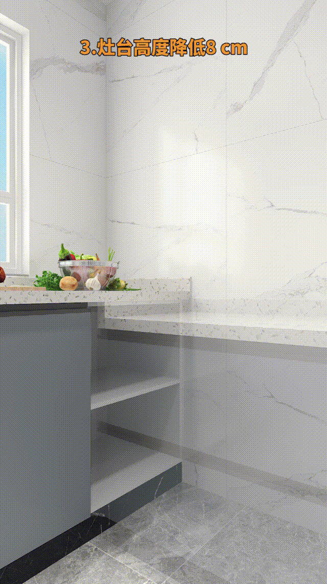 3.灶台高度降低8 cm,炒菜不架胳膊更舒服。