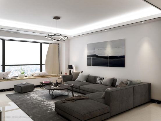 高级灰的L型布艺沙发,两个胡桃木茶几,高低错落,丰富了整个空间的层次美感。居中布置回环旋绕的吊灯,轻巧的造型,低调又时髦。