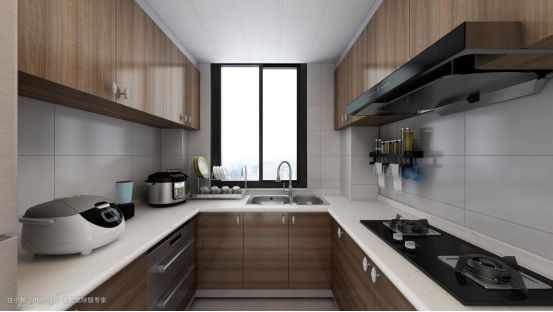 U型的厨房设计,动线合理,一侧是蒸饭区,另一侧是烹饪区,中间是洗切专用。烤漆面板的收纳柜,足以放下厨房各种小家电。