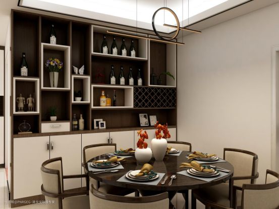 餐厅中间放置一款圆形的胡桃木餐桌,搭配六把同系列的餐椅,圆润、流畅的曲线,在出入餐桌时不易磕碰,提升了空间的质感与时尚感。