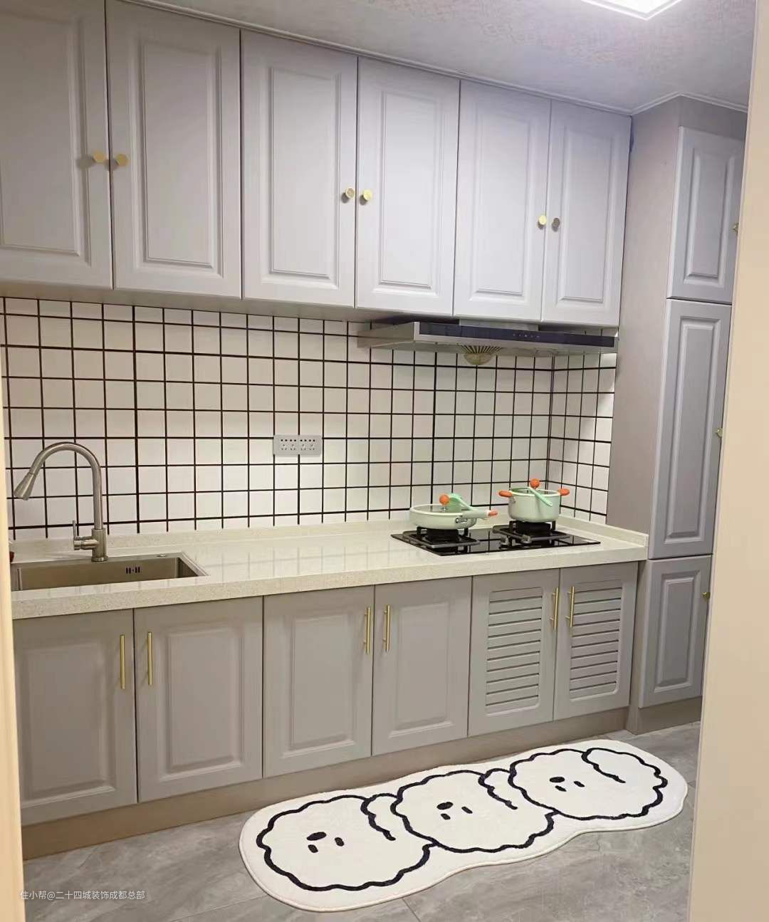 厨房是一字型的动线设计,可以节省空间,紧贴墙边,厨具以及其它物件都非常容易找到,墙面贴了白色小方块砖,一是在视觉上扩大了空间感,二是让厨房更加整洁舒适。