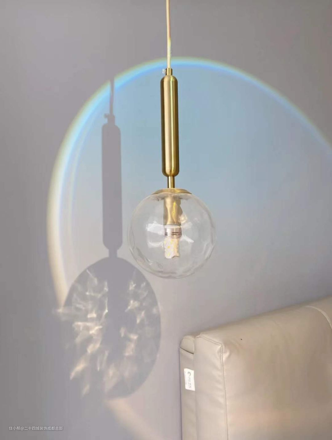床头黄铜吊灯的点缀恰好能起到提亮的作用,也为夜晚的床头阅读提供了柔和不刺眼的光线,非常温馨的氛围感。