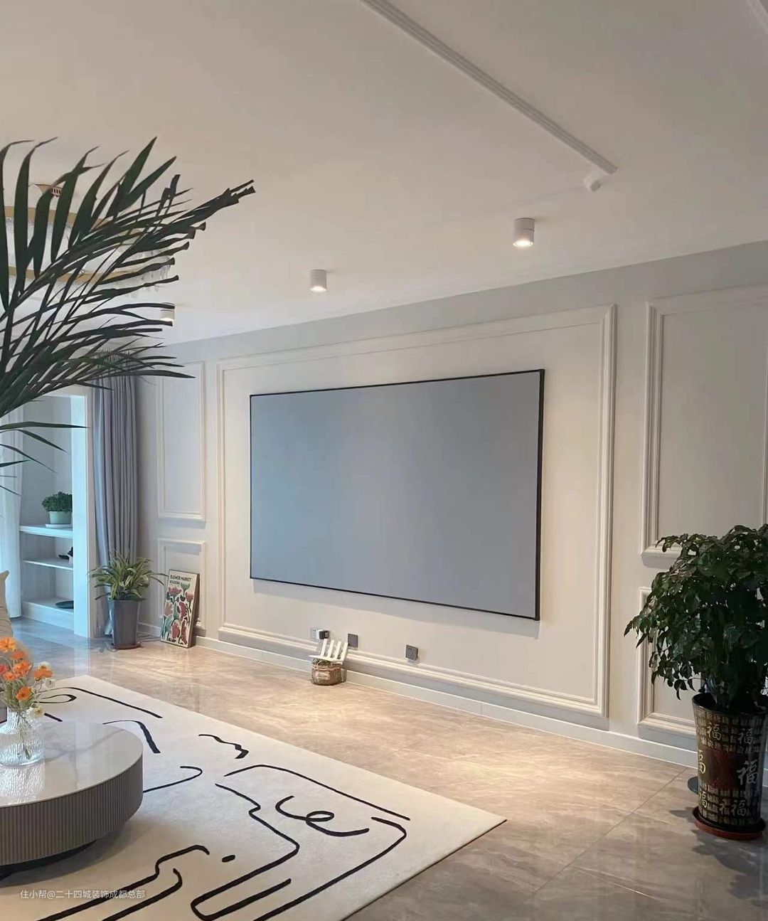 电视背景墙使用了简单的普通的石膏线,天花板也是石膏线做了造型,整体简洁又大气,省钱又有设计感。