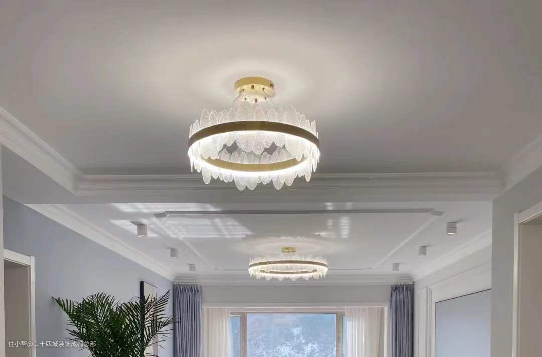 选择适合家里的灯具,绝对可以给整体添彩,我家客厅和餐厅都使用的是黄铜材质、通明磨砂玻璃花片的主灯,看起来像羽毛小天使,装饰华丽、色彩浓烈、造型精美,让空间充满高级感,同时给人以浪漫及惬意之感,考虑到层高问题,没有使用太长的吊线。