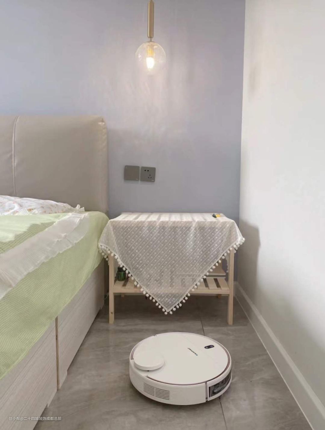 关于床头装饰,因为是极简风格,所以没有使用床头柜子,二是使用了百褶落地灯作为床头灯,榉木很有质感,米白色的灯罩简洁又柔和,暖暖的灯光让整屋都充满温暖的氛围感,随便摆在那里都很好看,优雅的像个仙女。