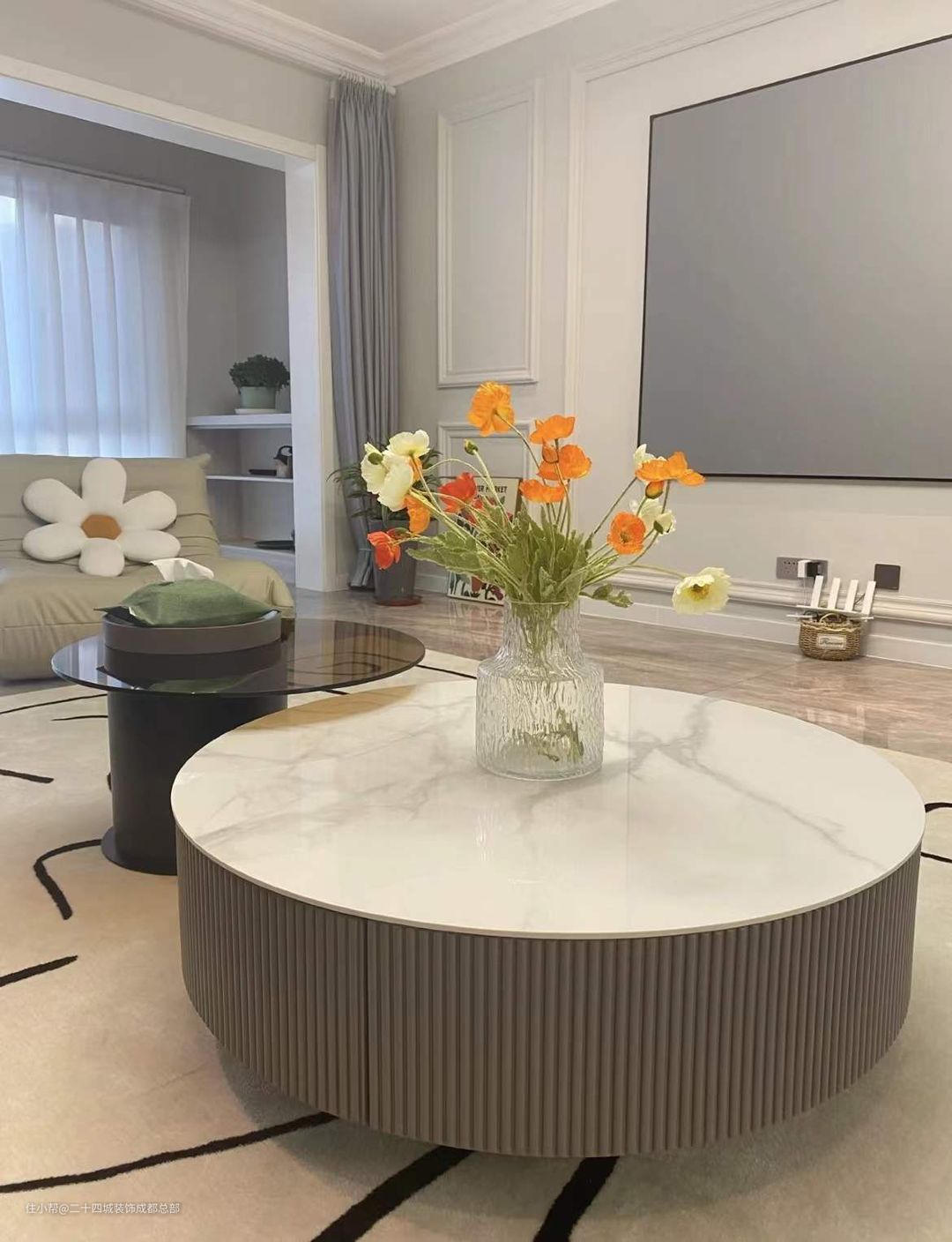 使用了圆形的组合茶几,增强该种产品的实用性的同时还添加了它的装饰性,这样错落别致的设计,不仅有层次感还能够摆放很多的东西,台面是大理石+亚克力,外观精美、纹理细腻、款式多样,可以满足不同人群的需求,且在使用时容易打理清洁。