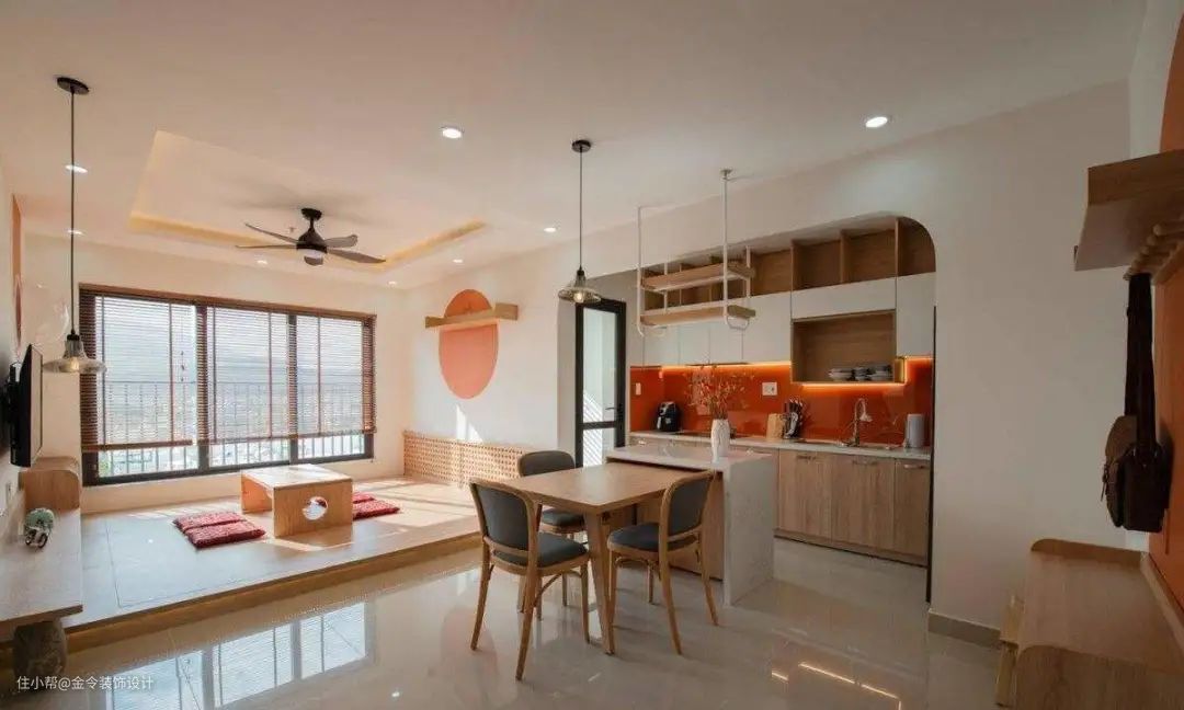 将厨房中岛与餐桌结合,能节省出不少空间,用途也不少。空间利用率高,做饭可以当操作台,吃饭可以当餐桌。