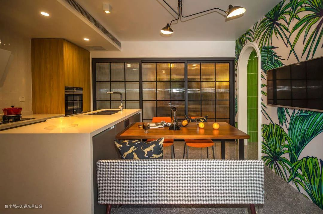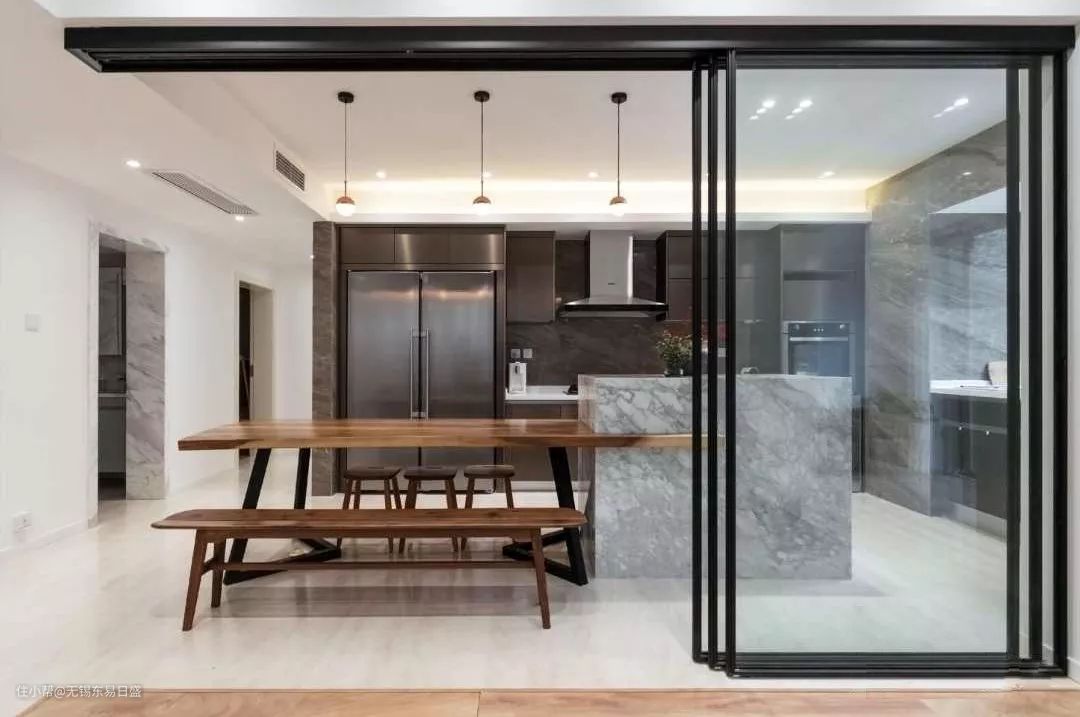 如果你想让家里厨房既有开放式的功能,又能隔绝油烟侵入其他空间,那么不妨试试透明美观又实用的玻璃隔断。这样既能让开放式厨房更加通透又能起到阻隔作用,并且还能有效隔离烹饪时的噪音,同时还能解决开放式厨房油烟大的问题。